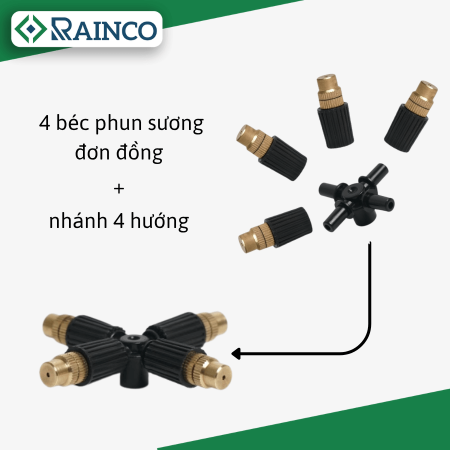 • Béc tưới phun sương đơn đồng kèm nhánh 4 hướng dùng phổ biến trong hệ thống tưới phun sương.